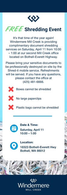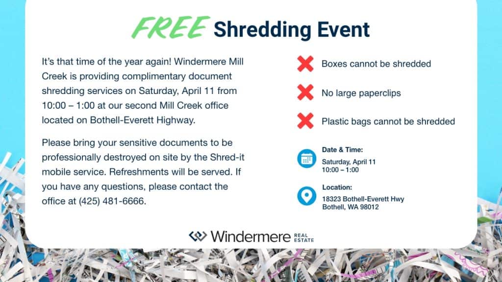 Windermere Real Estate Mill Creek (Chamber Visionary Member) is providing complementary document shredding services on Saturday, April 11th from 10am-1pm. Refreshments will be served.