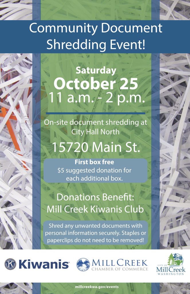 Join the Kiwanis Club of Mill Creek for free community paper waste shredding day! Shredding is free, donations encouraged. Donations benefit Kiwanis Club of Mill Creek and are used in our community.