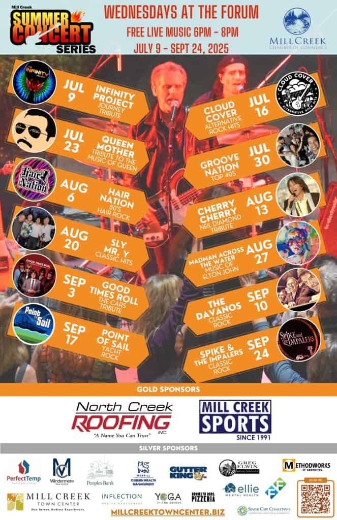 We are excited to return in the summer of 2025 with the “Mill Creek Summer Concert Series”. The concerts will run Wednesday evenings 6-8pm, July 9th through September 24th, at The FORUM in the Mill Creek Town Center.