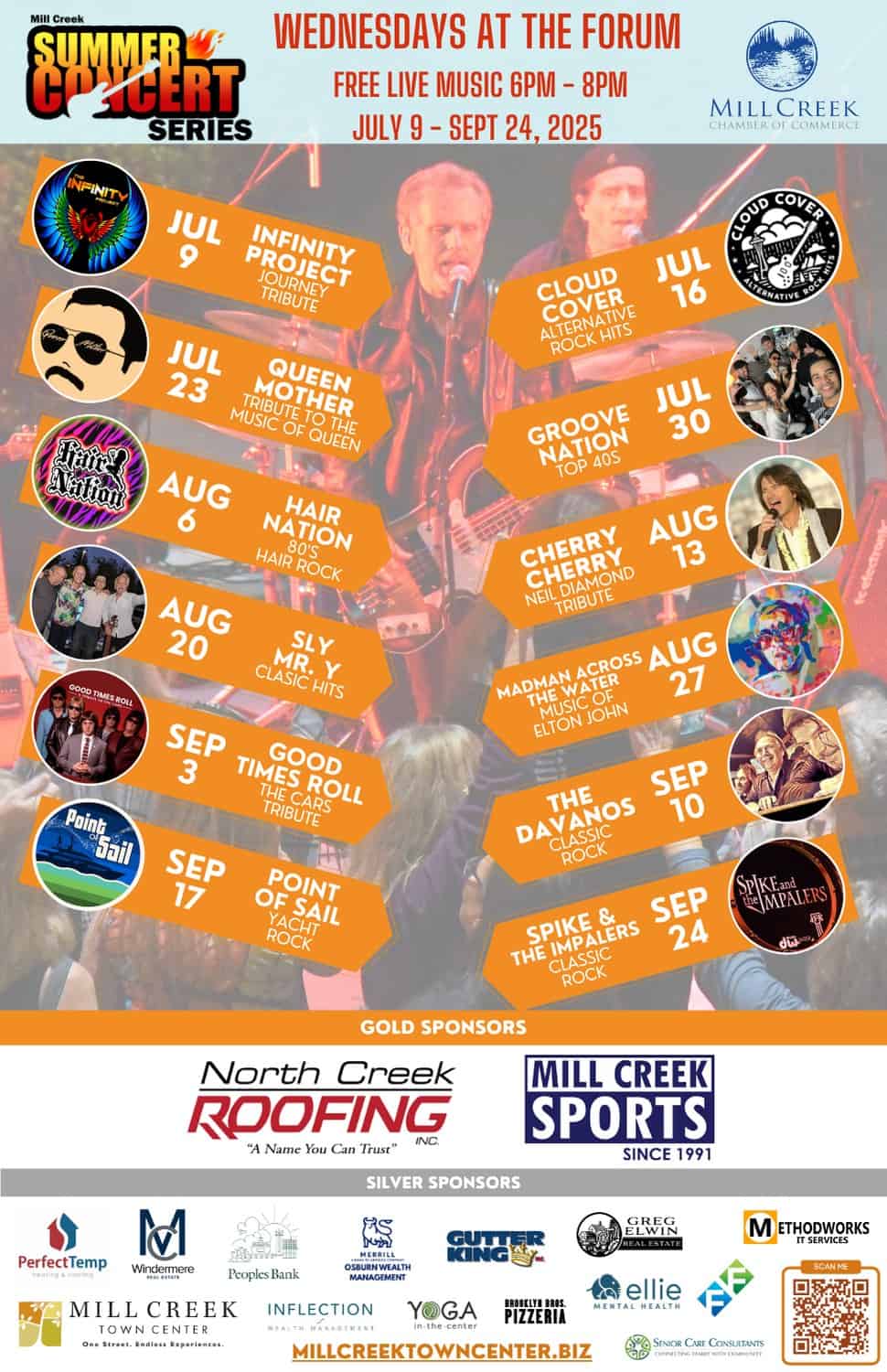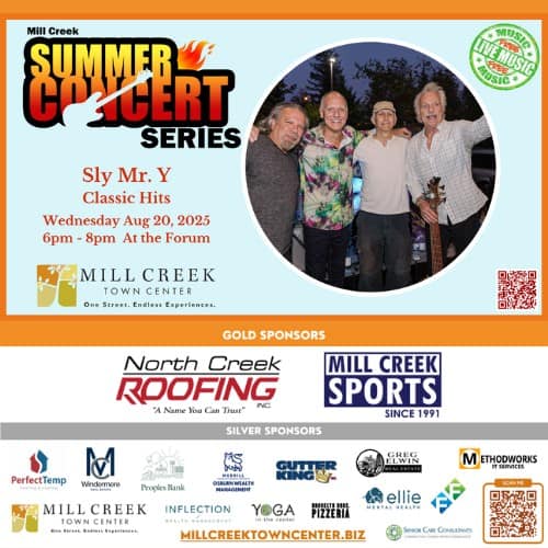 We are excited to return in the summer of 2025 with the “Mill Creek Summer Concert Series”. The concerts will run Wednesday evenings 6-8pm, July 9th through September 24th, at The FORUM in the Mill Creek Town Center.