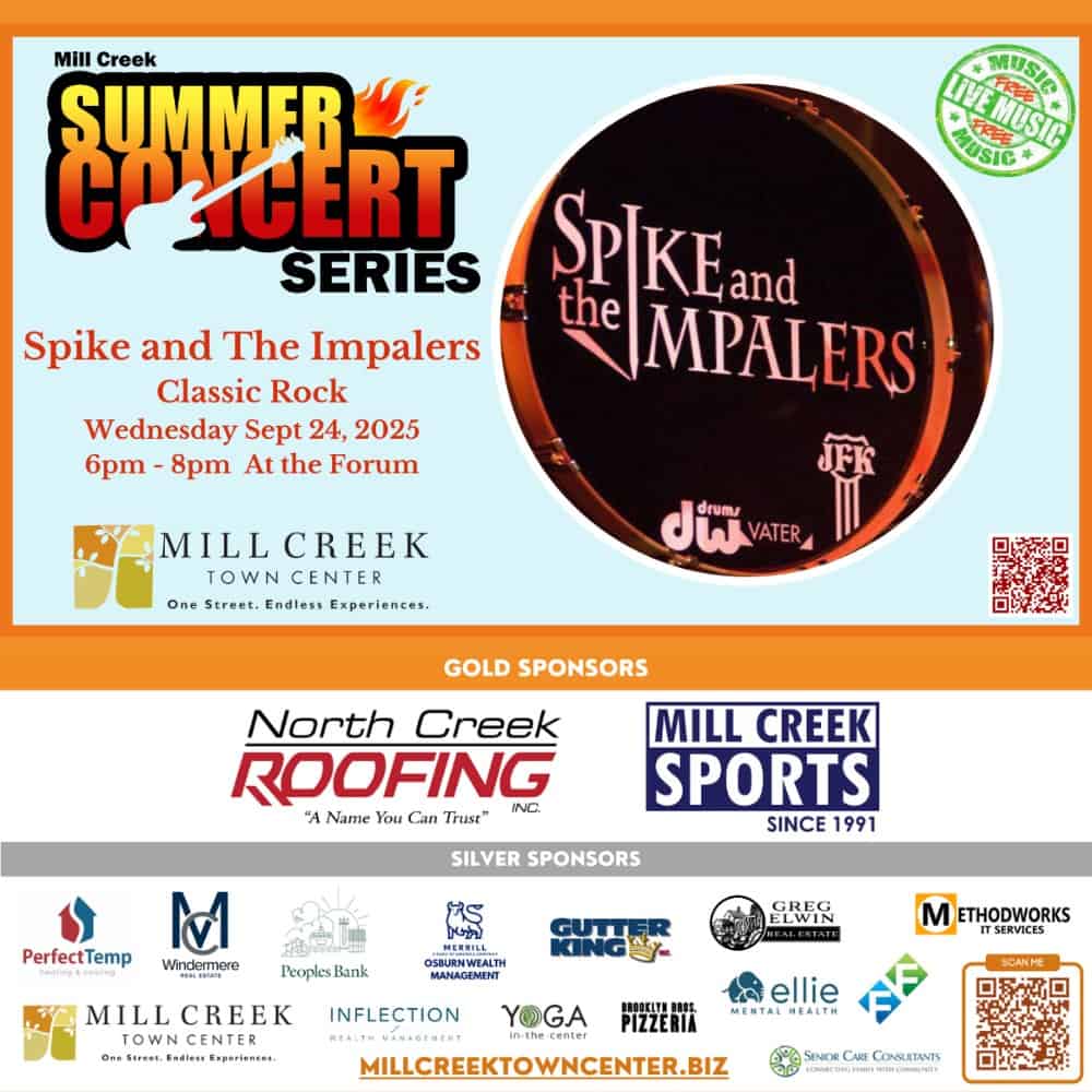 We are excited to return in the summer of 2025 with the “Mill Creek Summer Concert Series”. The concerts will run Wednesday evenings 6-8pm, July 9th through September 24th, at The FORUM in the Mill Creek Town Center.