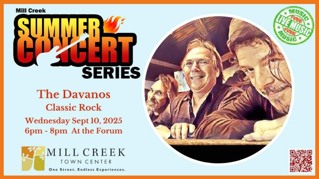 We are excited to return in the summer of 2025 with the “Mill Creek Summer Concert Series”. The concerts will run Wednesday evenings 6-8pm, July 9th through September 24th, at The FORUM in the Mill Creek Town Center.