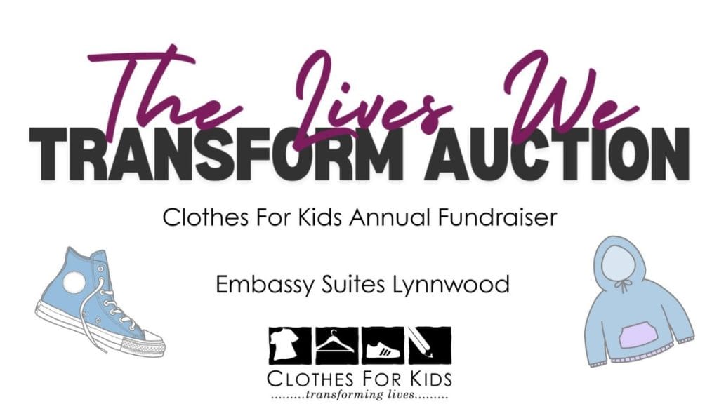 The Lives We Transform Auction is Clothes For Kids’ signature annual fundraising event, bringing together community members, donors, and supporters for an evening of generosity, celebration, and impact. Held on Saturday, March 14, 2026, at the Embassy Suites in Lynnwood, WA, the event features exciting silent and live auctions, a delicious dinner, and heartfelt stories highlighting the difference your support makes. All proceeds directly support our mission to provide free, high-quality school wardrobes to local students in need—helping them feel confident, prepared, and ready to thrive. Join us in transforming lives, one wardrobe at a time!