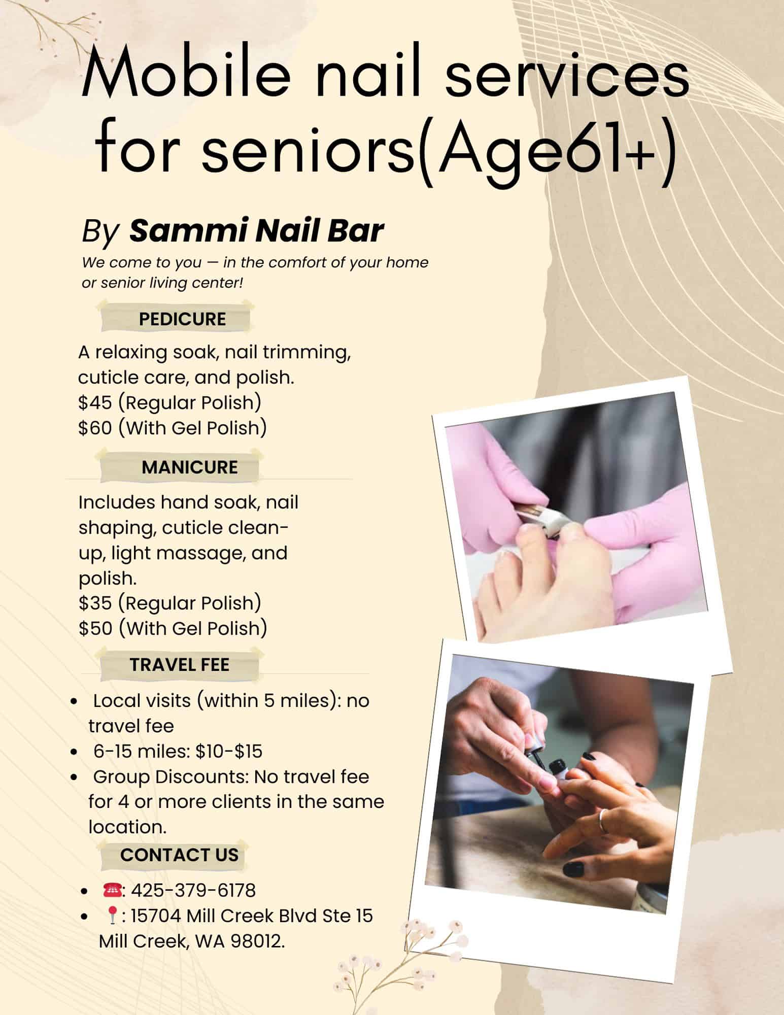 At Sammi Nail Bar, we now offer Mobile Nail Services for Seniors (Age 61+) – bringing salon-quality manicures and pedicures directly to seniors in the comfort of their home or senior living community.
