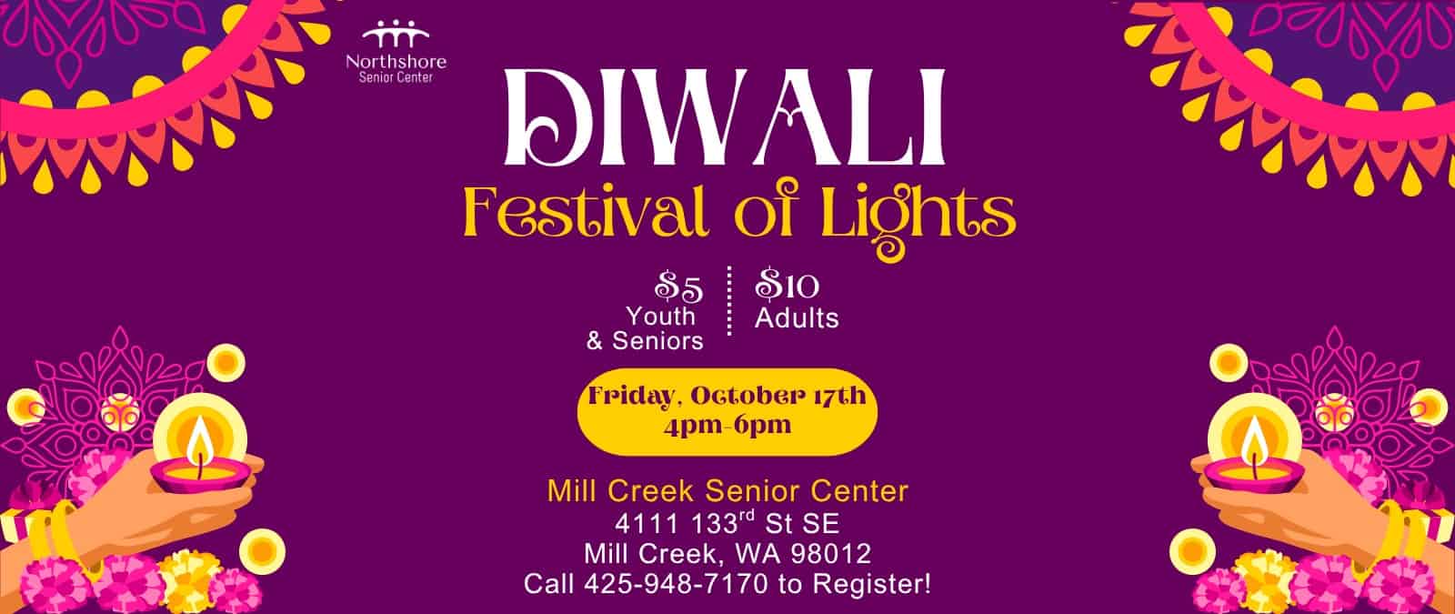 Diwali: Festival of Lights Friday, October 17, 2025 4pm-6pm 425-948-7170 to Register! Mill Creek Senior ( 4111 133rd St SE, Mill Creek, WA 98012) Ground level under Vintage apartments