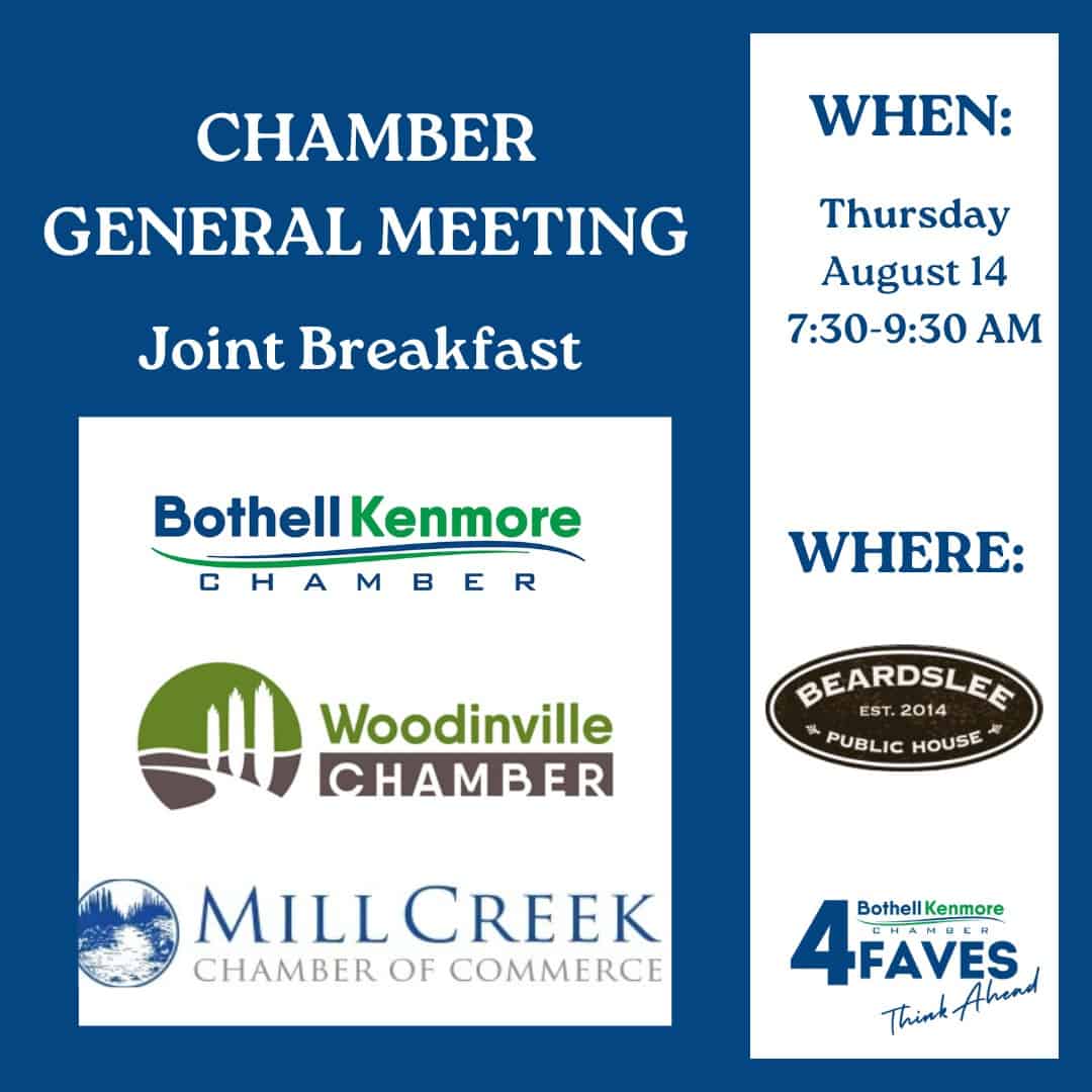Beardslee Public House (Bothell) Beardslee Boulevard, Bothell, WA, United StatesA joint networking event with 3 local Chambers: Bothell Kenmore, Mill Creek & Woodinville Enjoy the benefits of increased professional connections, collaboration opportunities, and referrals when you attend this joint networking breakfast. Guests/non-chamber members are very welcome and encouraged to attend. 📅 Date: August 14 📍 Location: Beardslee Public House, 19116 Beardslee Blvd Ste 102, Bothell, WA 98011 🕒 Time: 7:30 – 9:30…