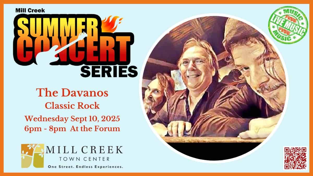 Forum Building in Mill Creek Town Center 15117 Main Street, Mill Creek, WA, United StatesSeptember 24th 6pm – 8pm Featured Band: Spike and The Impalers The Forum at Mill Creek Town Center 15115 Main St, Mill Creek, WA 98012 Announcing the 15th annual Summer Concert Series produced by Mill Creek Town Center and now Mill Creek Chamber of Commerce! We are excited to return in the summer of 2025…