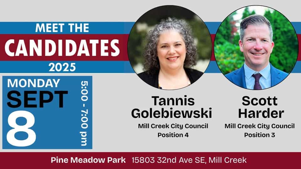 Pine Meadow Park 15803 32nd Ave. SE, Mill Creek, WA, United StatesJoin us for a casual meet & greet with Scott Harder (Position 3) and Tannis Golebiewski (Position 4) at Pine Meadow Park. This is an open, relaxed setting that has…